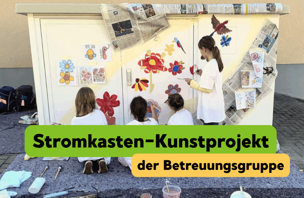 Durch den Stromanbieter ‚Energie Netz Mitte‘ bekamen wir die Möglichkeit für ein Kunstprojekt. Kinder der 3. Klassen haben mit viel Eifer und Kreativität den Stromkasten vor unserer Schule bemalt. In einem angedeuteten Riss kann man nun auf einer grünen Wiese vielfältige Blumen, Vögel und so manchen Käfer entdecken. Mit der künstlerischen Unterstützung einer Lehramtsstudentin, die zu diesem Zeitpunkt ein Praktikum bei uns machte, wurde daraus ein echter Hingucker.
