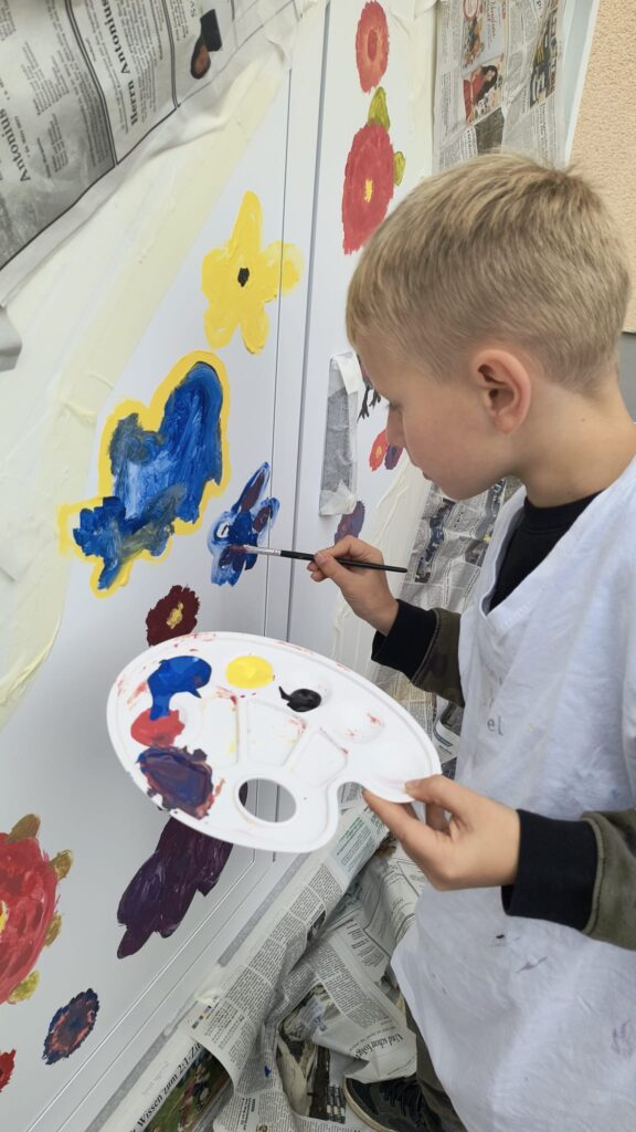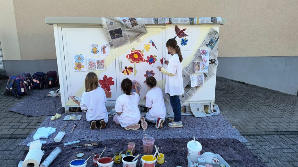 Durch den Stromanbieter ‚Energie Netz Mitte‘ bekamen wir die Möglichkeit für ein Kunstprojekt. Kinder der 3. Klassen haben mit viel Eifer und Kreativität den Stromkasten vor unserer Schule bemalt. In einem angedeuteten Riss kann man nun auf einer grünen Wiese vielfältige Blumen, Vögel und so manchen Käfer entdecken. Mit der künstlerischen Unterstützung einer Lehramtsstudentin, die zu diesem Zeitpunkt ein Praktikum bei uns machte, wurde daraus ein echter Hingucker.